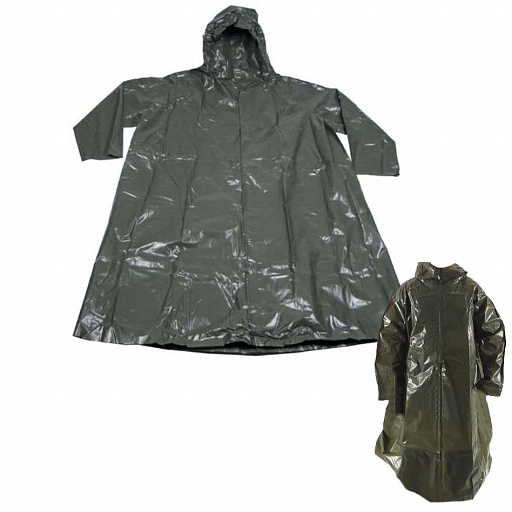 Армейский дождевик JP 75 Чехия PVC, цвет – оливковый поставляется 5 штут. Дождевик из очень плотного полиэтилена. Одевается через голову. В комплект входят: дождевик, бахилы-чулки, рукавицы с резинками на запястьях. На плаще сзади изнутри два кармана, в которых лежат рукавицы и бахилы.